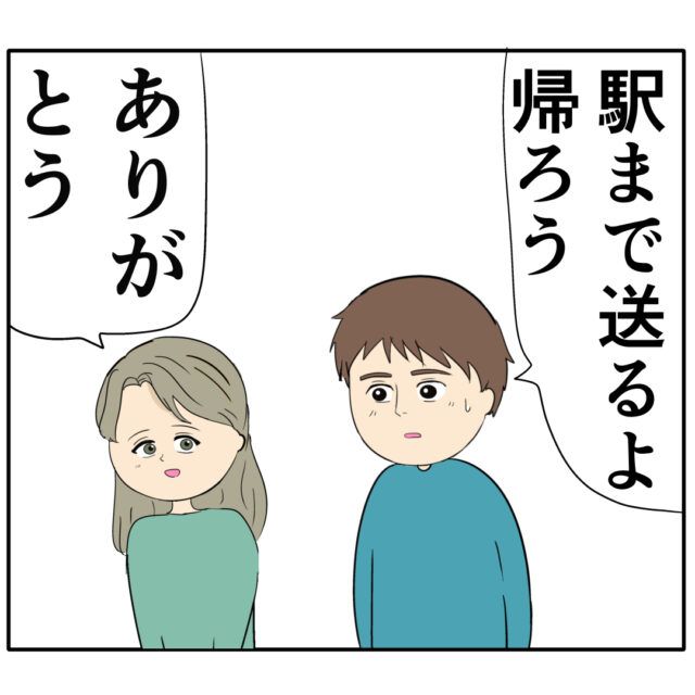 別れてからもずっと好きだった元彼女ジュリ実さんが心配で、妻に嘘をついてまで駆けつけたろみ緒さん。「駅まで送るよ。帰ろう」「ありがとう」ジュリ実さんの無事を確認したろみ緒さんは、ジュリ実さんを駅に送ることにしました。