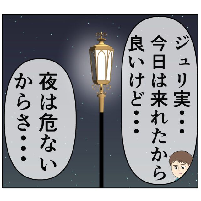 「ジュリ実・・・今日は来れたから良いけど・・・夜は危ないからさ・・・」ろみ緒さんは夜に一人で公園にいるのは危ないとジュリ実さんに言いました。