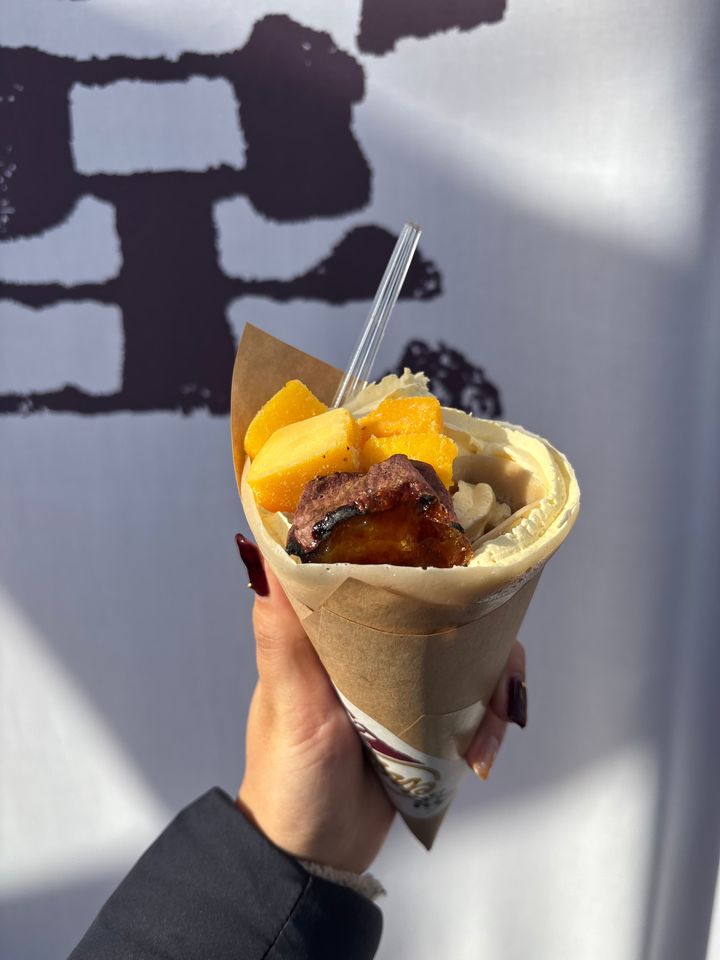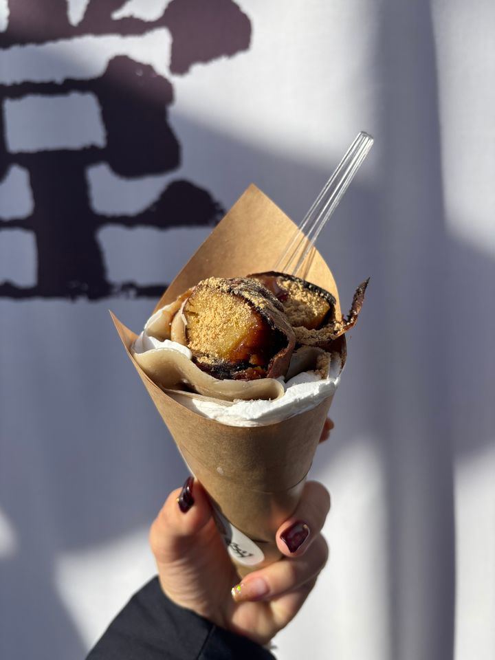 黒蜜ときな粉がかかった和洋折衷なクレープが絶品🍠🤍