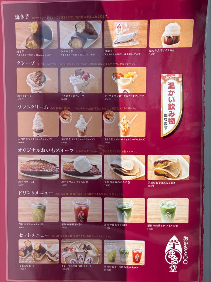 シンプルな焼き芋から、お芋クレープや、あんこ巻き、ソフトクリーム等、お芋を使った和スイーツがずらり!🍠