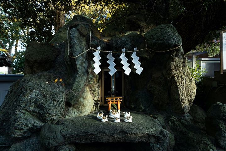 「厳島神社」の朱塗りの鳥居をくぐり奥へ進むと見えてくるのが、多くの参拝者がお目当ての、白く、つるりとした御姿で鎮座する白蛇の「撫で蛇様」。白蛇の精は、弁天様のお使いとして、人々の願いを聴き届けるといわれています。