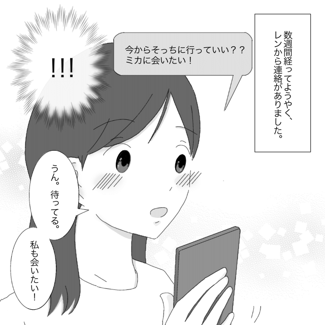 それから連絡が取れないまま数週間が経ち、ようやく彼から連絡がありました。「今からそっちに行っていい??ミカに会いたい!」彼からのそのメッセージに私はただただ嬉しくて「うん。待ってる。私も会いたい!」とすぐに返信しました。