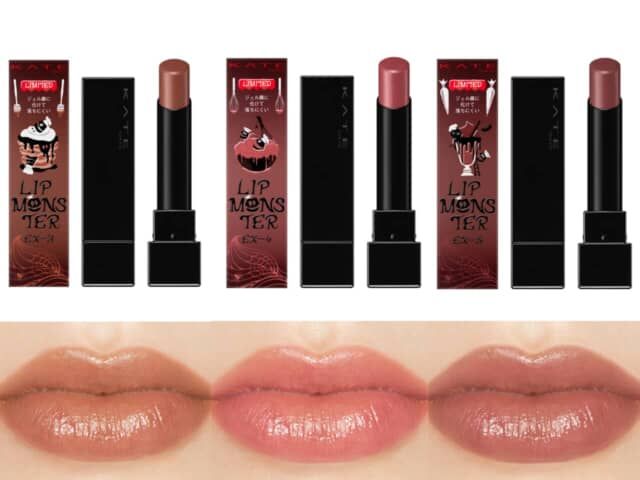 ▲【数量限定】ケイト リップモンスター 新3色(左からEX-3 生焼けパンケーキ、EX-4 ピンクバナナホイップ、EX-5 ヴァンパイアフラッペ) 各¥1,540(税込)