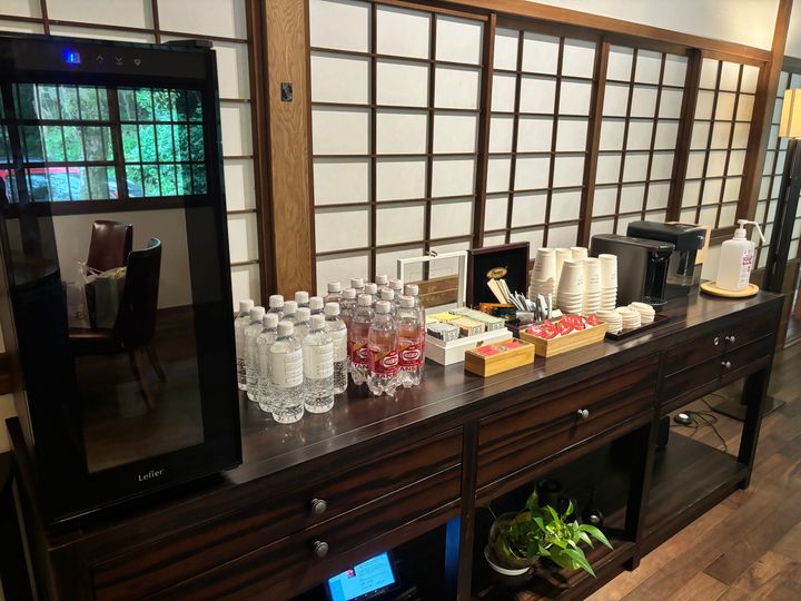 ここでは、サービスでお菓子やドリンク、なんとワインまで!自由にいただくことができます。