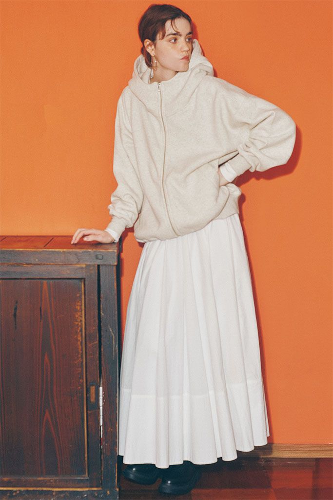 【POINT】顔まわりまで包み込むビッグパーカには、全体のバランスを整えるように、ハリのある生地でスカートもボリュームアップ。淡色で統一して見た目は軽やかに。