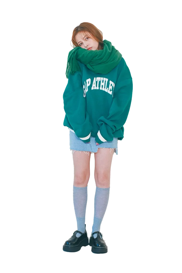 グリーンロゴスエットトップス(メンズ)6,990円/Gap デニムスカート 4,950円/スピンズ ストール 4,990円/MANGO ローファー 12,900円/チャールズ&キース(チャールズ&キース ジャパン)靴下/スタイリスト私物