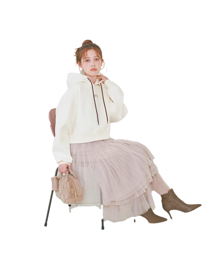 甘いワンピと好相性なちびロゴフーディ。甘めの小物でそろえれば、テイストミックス完成♡