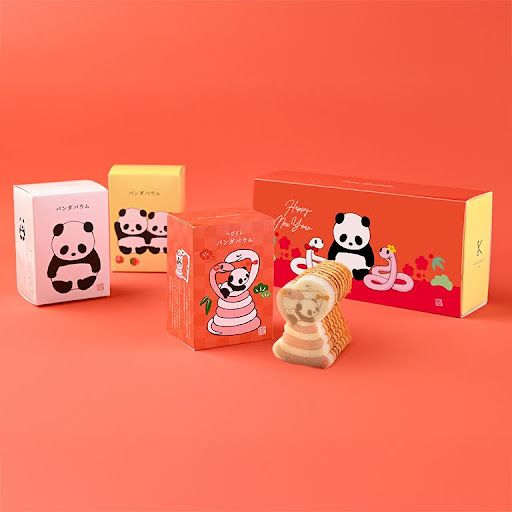 ていねいに幾重にも焼き重ねられた平焼きバウムクーヘンに、絵を描いて切れ目を入れた可愛い商品が人気の「カタヌキヤ」からも、期間限定の「へびどしパンダバウム(ミルク味)」が登場。定番の「こどもパンダバウム(いちご味)」、「パンダバウム(プレーン)」をセットにして、限定デザインのパッケージに詰められています。パンダと紅白のへび、松竹梅をあしらったお正月らしいデザインです。