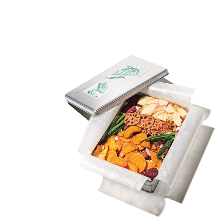 10種類以上の野菜や果物のチップスやおかきやせんべいなどが贅沢に詰め合わせれた吹寄せ菓子は「逸品会」の宴の華