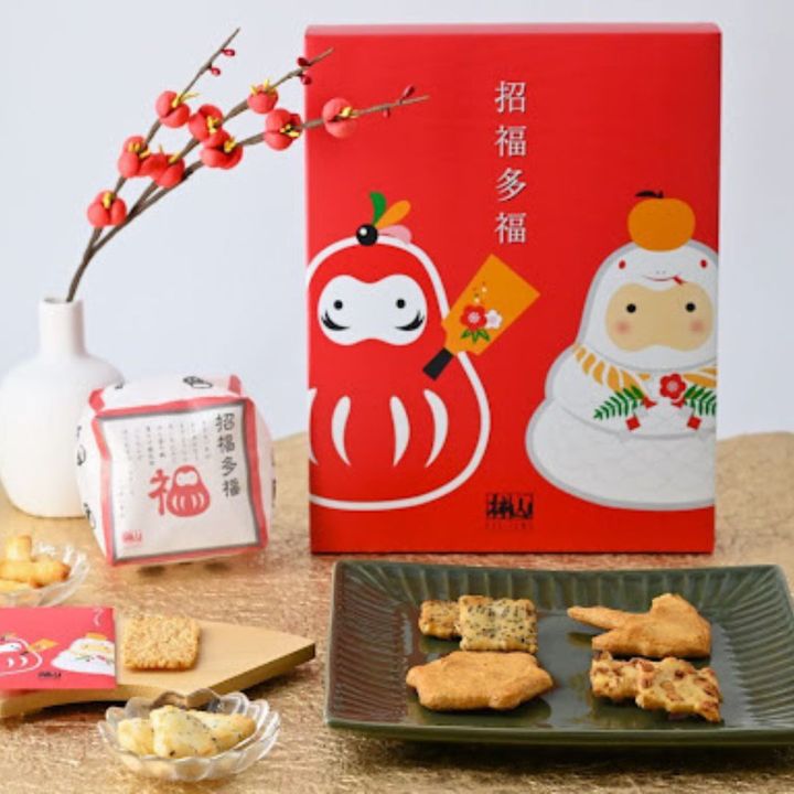 だるまと干支だるまが描かれた、愛らしく縁起の良いパッケージが素敵な「招福多福」。おめでたい鶴亀せんべいや、ぽち袋に入った「ぽちおかき」など、お年賀にぴったりの縁起ものづくしです。富山の薬売りが子どもたちに配っていた四角いサイコロ型の紙風船が一緒に入っているので、子どもがいる家族でも楽しめるお年賀です。
