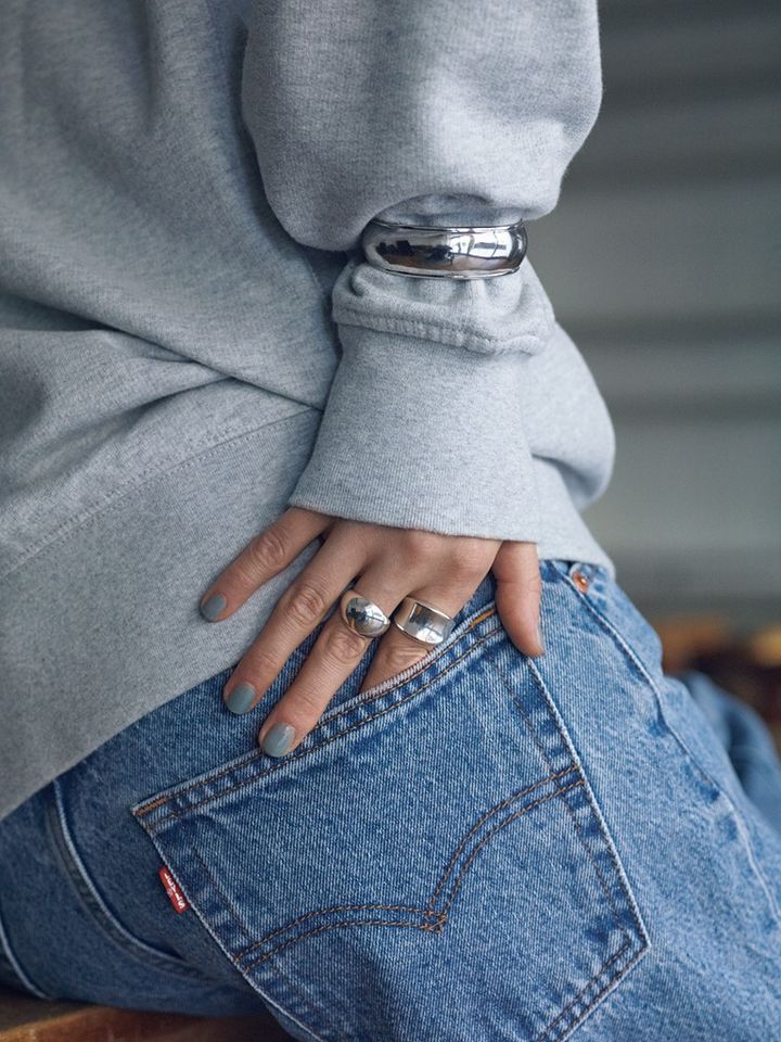 シルバーバングル、〈人さし指〉シルバーワイドリング、〈中指〉シルバーラウンドリング/以上サム バイ リラ(リラ スピック&スパン ルミネ有楽町店) グレースエット、共布ベルトつきデニムパンツ/ともにLevi’s(リーバイ・ストラウス ジャパン)