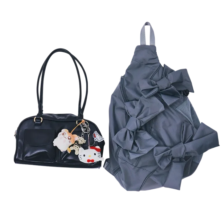 グレーのリボンがいっぱいついたリュックはmerry jennyのもので、PCやカメラなど仕事グッズ入れに。黒のバッグはSHEINで購入。