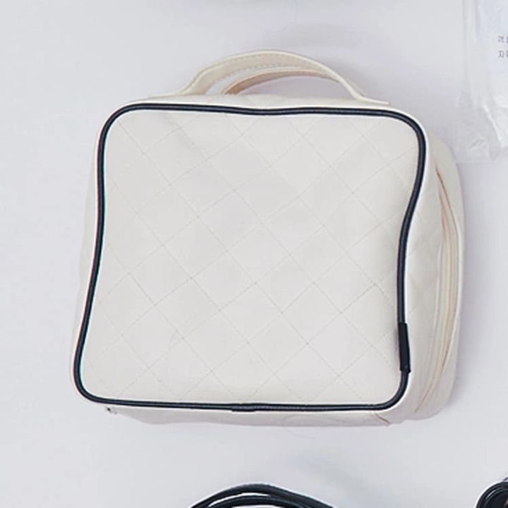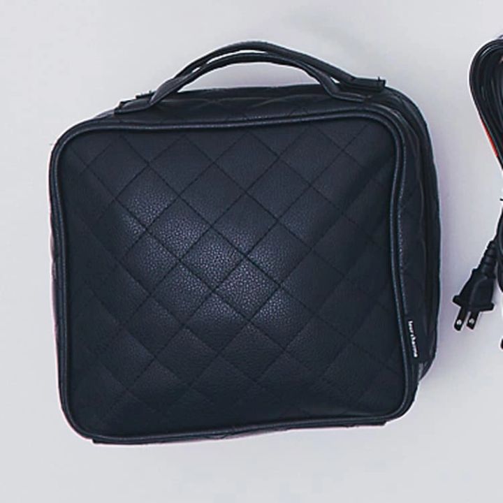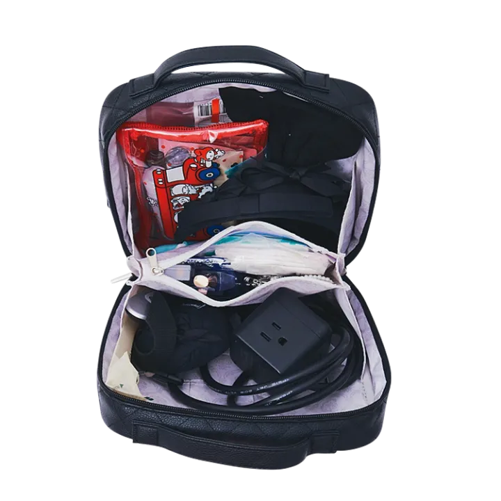 白のポーチの黒バージョン。自立して使いやすいし、内ポケ・外ポケと収納が多いのでメイクポーチ以外にも◎。