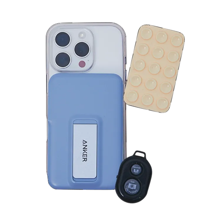 右上の吸盤をスマホにつけて壁に取りつければ、自撮りも楽ちん。下のシャッターボタンで完璧!