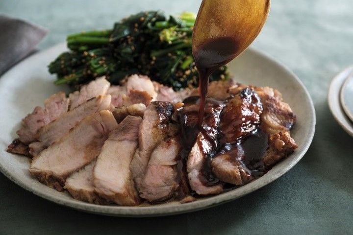ゆでたほうれん草は長さ4cmに切っていりごまとあえ、器に盛る。豚肉を幅1cmのそぎ切りにして器に並べ、フライパンのたれをかける。