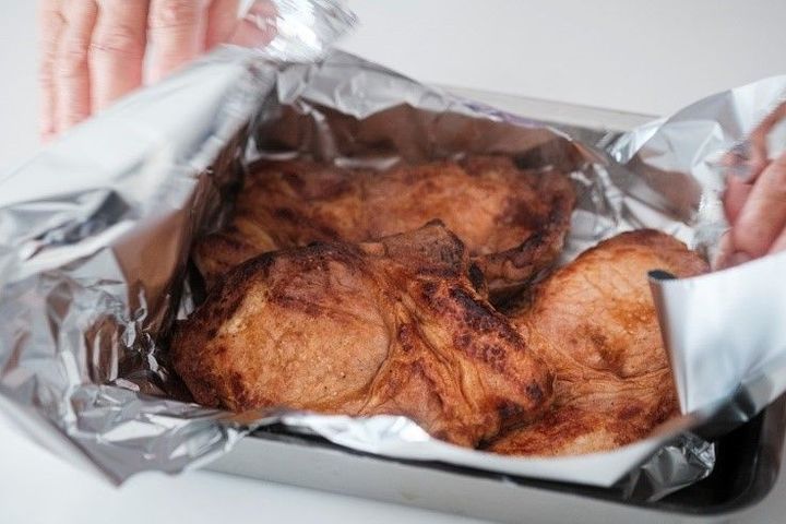 豚肉には余熱でしっかり火を入れたいので、すぐにアルミホイルを2重にして包み、保温を。バットにのせ、コンロのそばなど温かい場所に置くとベターです。