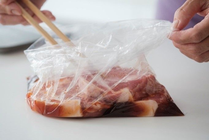 ポリ袋に下味の材料を入れて混ぜ、豚肉を加えて味をからめる。袋の中の空気を抜いて口を閉じ、室温に30~60分置く。