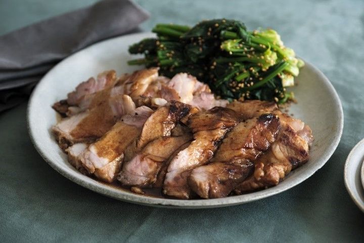 甘辛味がしっかり染みた柔らか~い煮豚は、いつものとんカツ用肉とは思えない驚きのおいしさ。ゆでたほうれん草も、ちょっとごまをまぶすだけで、粋で絶妙な箸休めに。