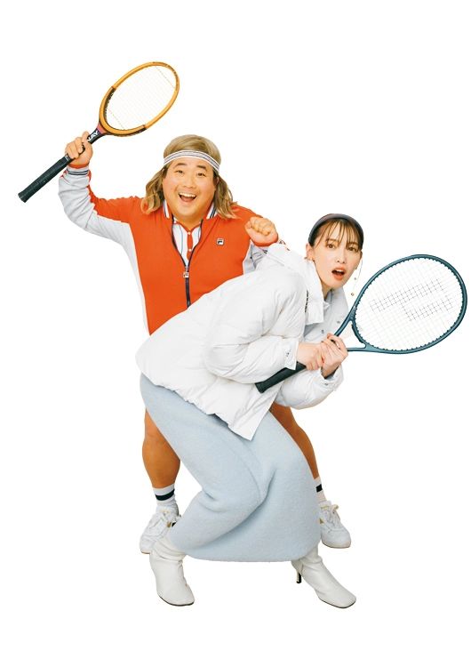 ショートダウンジャケット¥24,970/LILY BROWN(LILY BROWN ルミネエスト新宿店) ニットセットアップ(カーデ)¥11,000、ニットセットアップ(スカート)¥11,000/e/rm(アダストリア) ショートブーツ¥2,420/神戸レタス カチューシャ¥22,000/アレクサンドル ドゥ パリ(アレクサンドル ドゥパリ GINZA SIX店) ロングイヤリング¥1,650/RANDA ラケット¥41,800/プリンス(グローブライド)