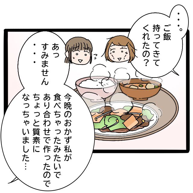 「・・。ご飯持ってきてくれたの?」カオリさんの質問には答えずご飯をみつめるみずほさん、「あっ、すみません・・今晩のおかず、私が食べちゃったみたいで、あり合わせで作ったので、ちょっと質素になっちゃいました・・」申し訳なさそうにカオリさんが答えました。
