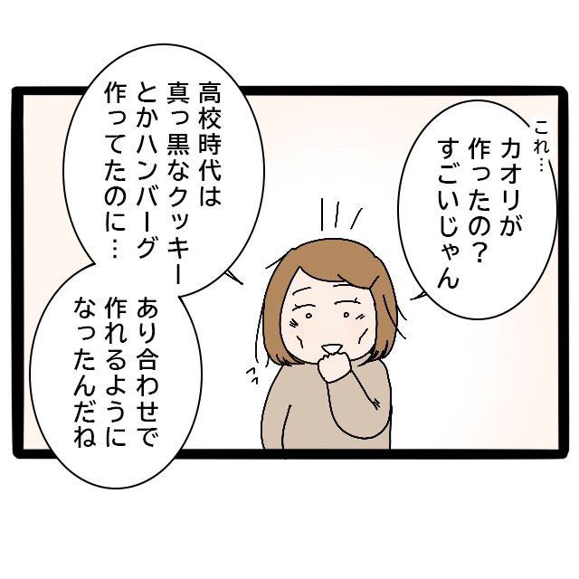 「これ・・カオリが作ったの?すごいじゃん!高校時代は、真っ黒なクッキーとかハンバーグ作ってたのに・・あり合わせで作れるようになったんだね」と感心するみずほさん。