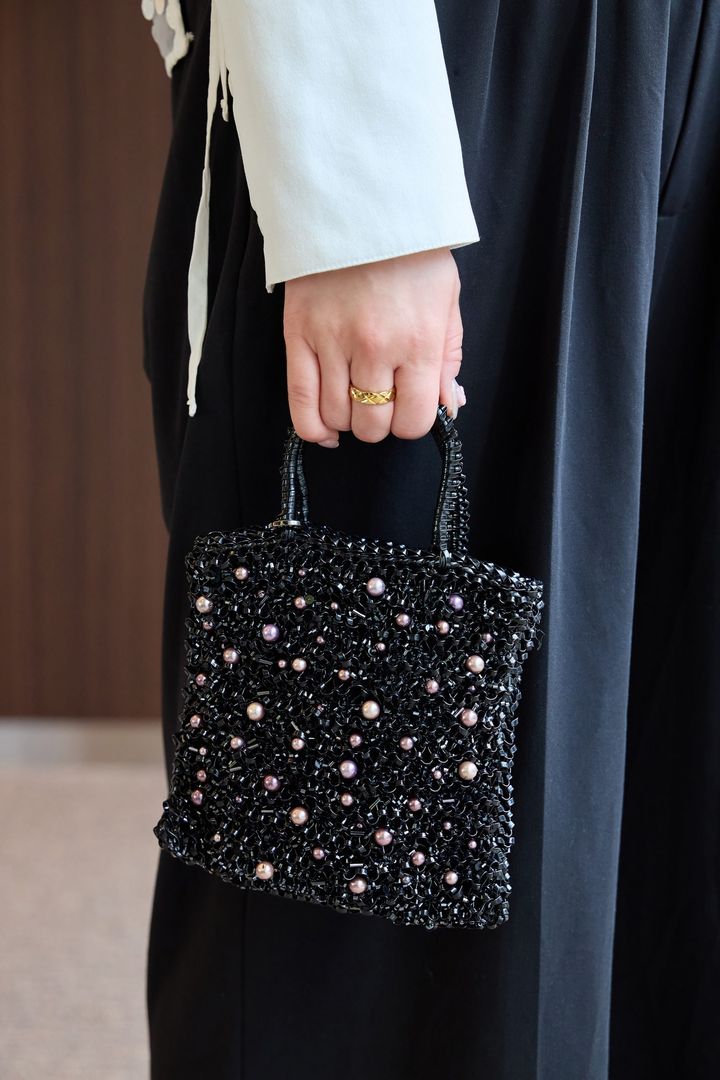 「定番のデザインは中身が少し透けるのでなかなか購入に踏み込めなかったところ、裏地付きがタイミングよく発売されたので即決でした。パールがアクセントになって黒でも重くなりすぎず、甘めのコーデにも取り入れやすいのが気に入っています。使い勝手の良さにほかのカラーも欲しくなり、定番のピュアシルバーピンクも購入しました」石川菜生さん/40歳・162㎝・歯科衛生士(11歳と8歳と5歳の女の子ママ)