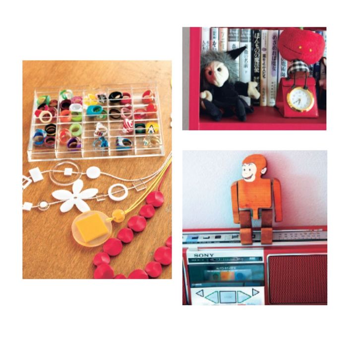 左:金属アレルギーなのでジュエリーがつけられません。そのかわりにこんなカラフルなネックレスや指輪を日替わりで楽しんでいます。右上:本棚はリビング、ダイニング、仕事部屋などあわせて20本近く!右下:ものがない時代を経験したせいでなかなか捨てられない。今も現役のラジカセ。