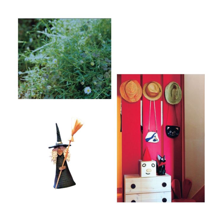 左上:季節の花が咲く小さな庭。甘夏やブラッディオレンジの木を植えて自家製ジュースを作ります。左下:部屋には世界各地を旅して集めた魔女グッズのコレクションがたくさんあります。右:玄関。小さなチェストの上に乗る三角帽子の顔は広松木工オリジナルの子ども用の家具。中にはハンカチやスカーフをしまって。