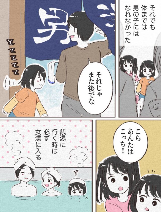 三兄弟の従兄弟たちを真似て過ごしていた奈々さん、でも体までは男の子になれませんでした。銭湯に行った時、お父さんについて行こうとすると、「それじゃ、また後でな」とお父さんに言われ、お姉さんには「こら、あんたはこっち!」と言われて女湯に。銭湯では必ず女湯に入る、それが腑に落ちない奈々さん。