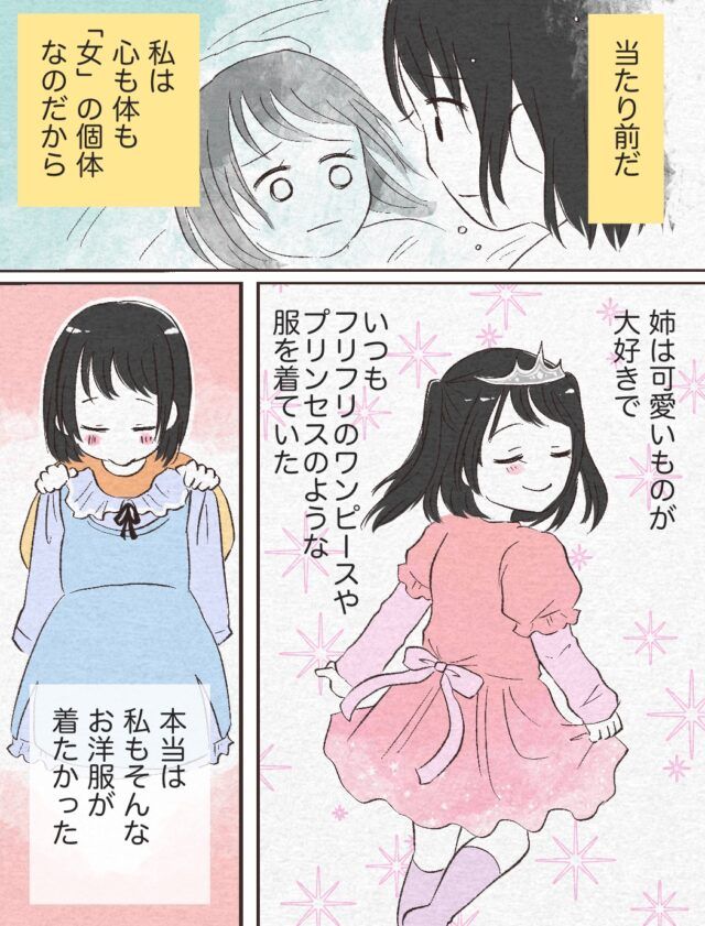 「当たり前だ。だって私は心も体も『女』の個体なのだから」わかっていても納得がいきませんでした。可愛い物が大好きで、いつもフリフリのワンピースやプリンセスのような服を着ていたお姉さん、奈々さんも本当はお姉さんのような洋服が着たいと思っていました。