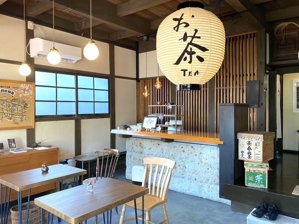 扉を開けると、茶葉のいい香りと大きなちょうちんがお出迎え。いつか来たことがあるような懐かしさに包まれます。入ってすぐの土間にはテーブル席が並んでいます。