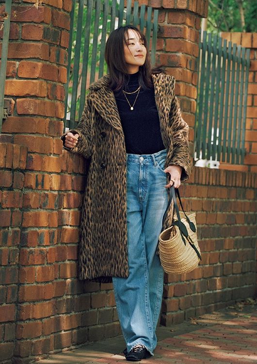 適度なゆとりがあり、ヴィンテージムードなデニムパンツがパリっぽコーデにひと役。シンプルなベロアトップスやフラットなバレエシューズでリラクシーなムードにまとめつつ、仕上げの旬柄コートとラフィア素材のバッグでしゃれ感を高めるスパイスをプラス。さりげないのにこなれてる、パリジェンヌらしいムードをまとってお出かけシーンをもっと楽しく。
