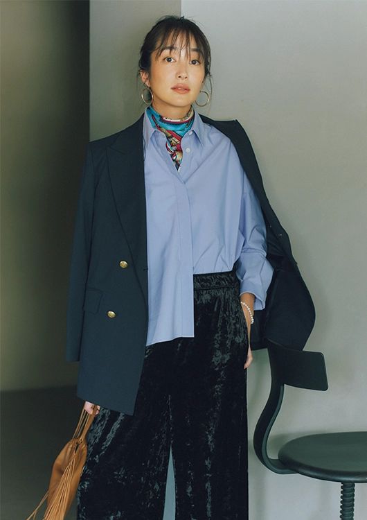 シャツ¥45,100/マッキントッシュ(マッキントッシュ ギンザシックス店) ジャケット¥55,000/ウィムガゼット(ウィムガゼット ルミネ新宿店) ベロアパンツ¥22,000/アンタイトル スカーフ¥19,800/マニプリ ピアス¥13,750/ココシュニック オンキッチュ(ココシュニック) ブレスレット¥5,940/アプロ(ロードス) バッグ¥35,200/オルセット(オルサ)