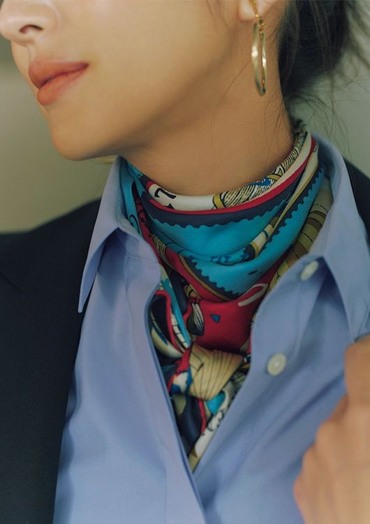 〝フレンチシック〟を体現するトリコロールカラーのスカーフは、小分量でも装いに変化をつけられる優秀アイテム。チラッとのぞかせてアクセ感覚に、装いを多彩な表情へとアレンジするのも素敵。