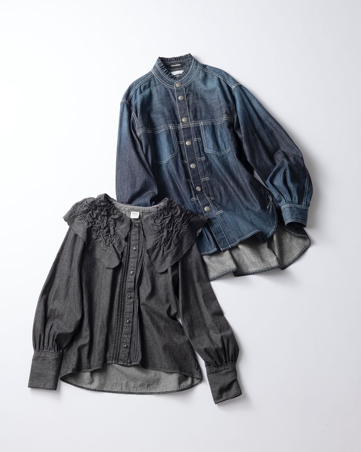 【右から】シルバーボタンデニムブラウス¥38,500(ニアー ニッポン/ニアー) フリル付きデニムブラウス¥12,980(サムシング/エドウイン)