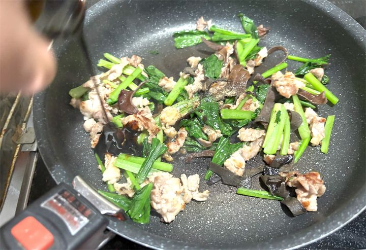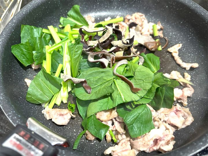 上の画像のように、豚肉にだいたい火が通ったら、1の小松菜ときくらげを入れてさらに炒めます。