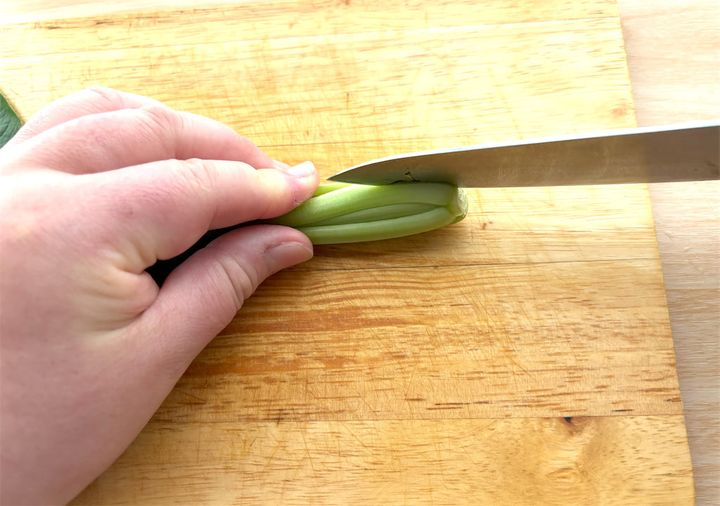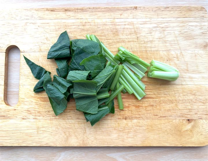 小松菜は軽く洗って水気を取ってから根の方に数cm切り込みを入れ、