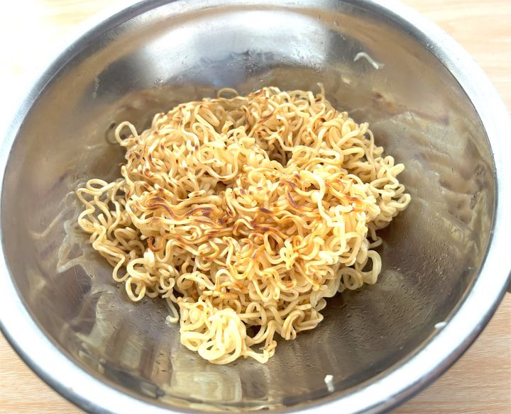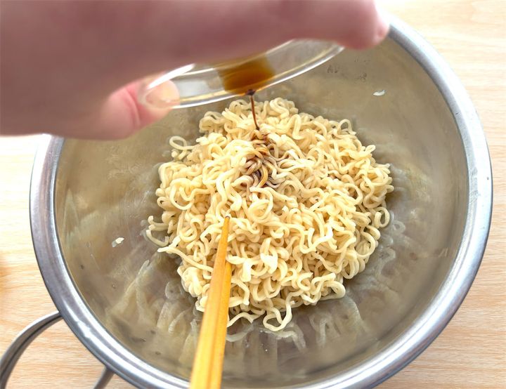 焼き色をつけた麺は、下の画像のように一度フライパンから取り出してボウルに入れておきましょう。
