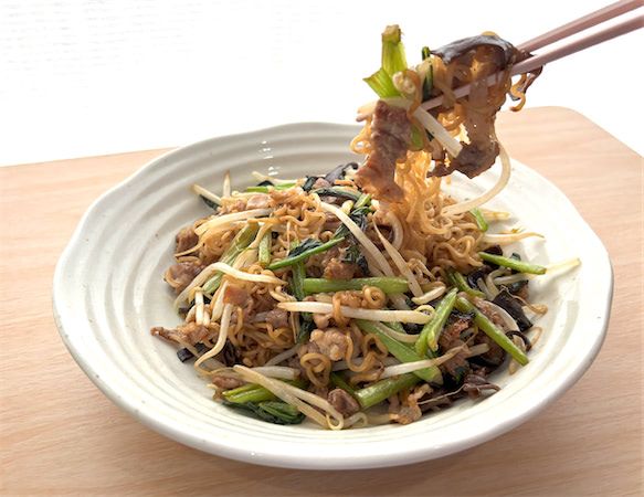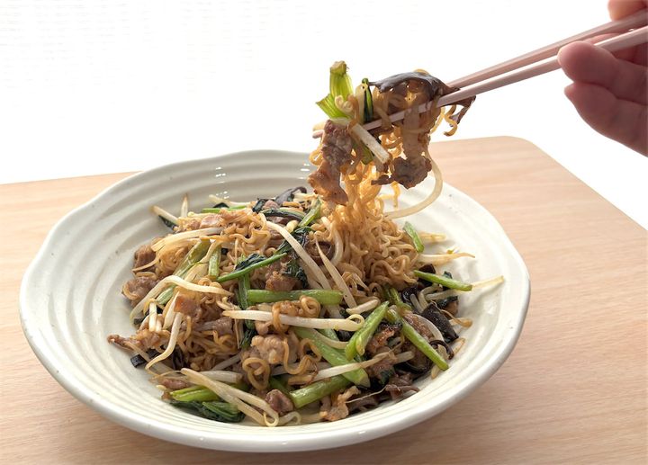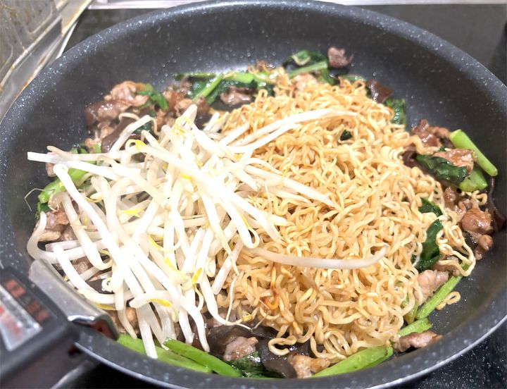 全体を軽く炒めたら、2の麺を戻して、最後にもやし、酒を加えて、ざっくりと炒めたら完成です!