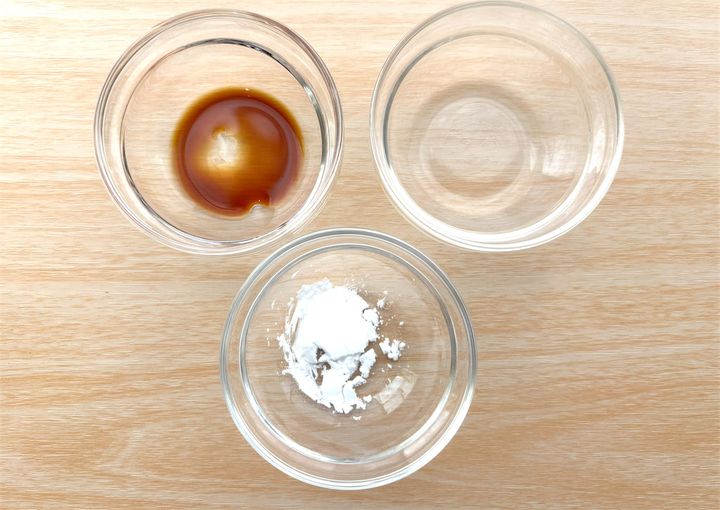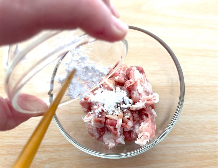 下の画像のように、切った豚肉を小皿に入れてから、Bを絡めておきます。