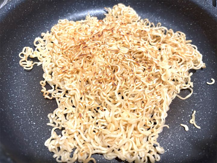 火加減は中火(IHクッキングヒーターだと160~180℃)で、麺を広げて両面に軽く焼き色が付くように焼きます。