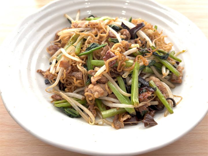 小松菜やもやしのシャキシャキとした食感と、きくらげのコリコリ感、そして焼き色を付けた麺の香ばしい感じがすべてよくマッチしています。