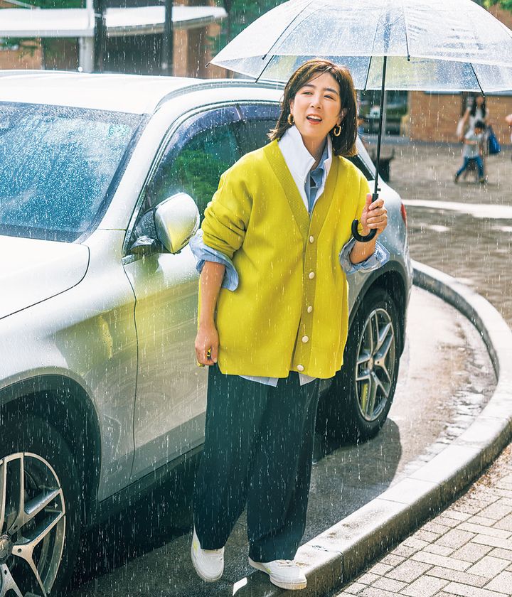 雨が土砂降りの朝、息子を駅まで送るも、仕事に遅れそう!「タクシー運転手か! 」と泣きたくなるけどそんなときこそ明るいカラーのカーデでテンションUP。スウェットにもバサッと羽織れるゆったり感が◎。