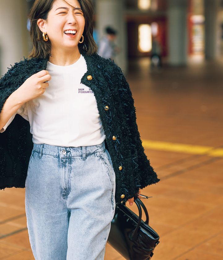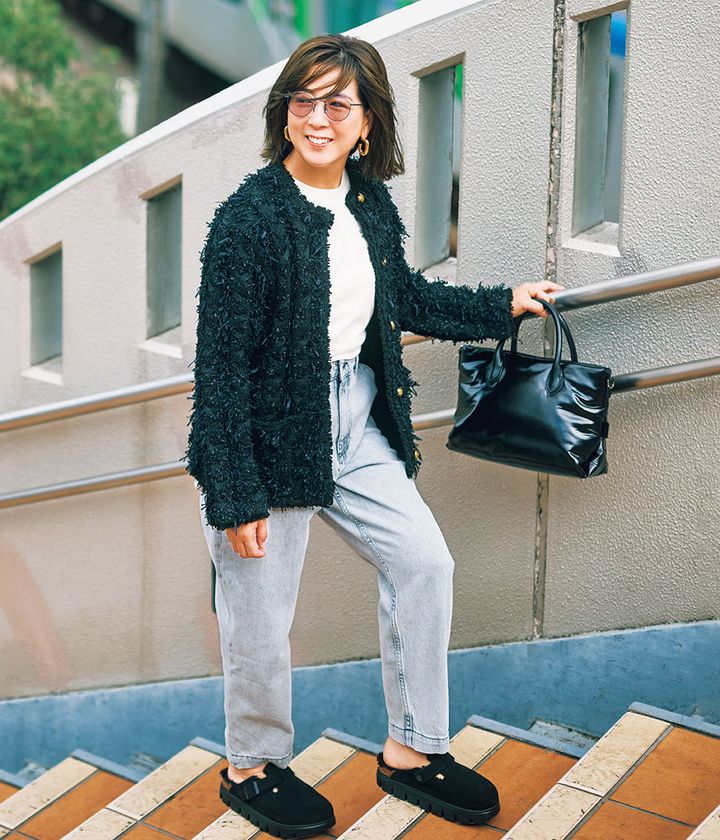 人気スタイリスト・竹村はま子さんは、郊外に引っ越してからライフスタイルがすっかり変わったそう。「ご近所アウター」はいかにもアウターより【ざっくりとした編み地のカーディガン】が動きやすいうえ、部屋着に羽織るだけで程よいきちんと感が生まれて重宝すると言います。