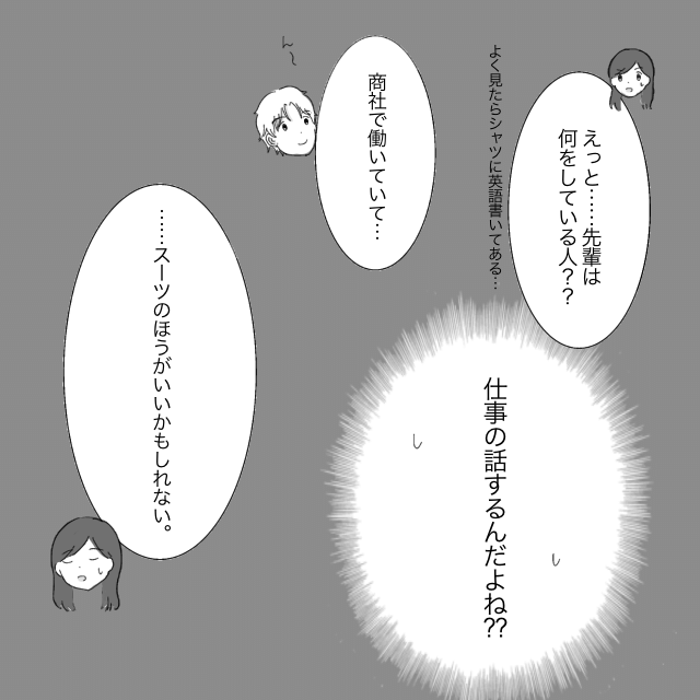 仕事の話するんだよね??と思いながら「えっと・・・先輩は何をしている人??」と聞いてみると、「商社で働いていて・・・」と言う彼。私は「・・・スーツのほうがいいかもしれない」とアドバイスしました。