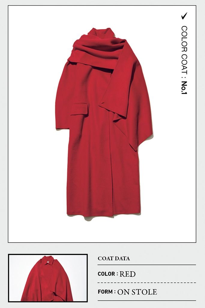 発色が強いぶん、縦に落ちるようなシルエットを形成するソフトな素材感を選択。取りはずしできるストールが、長くて薄いウールのしなやかさを助長し、赤の迫力を緩和。大判でいっそう上品に。 共布ストールつき赤ロングコート/バナナ・リパブリック