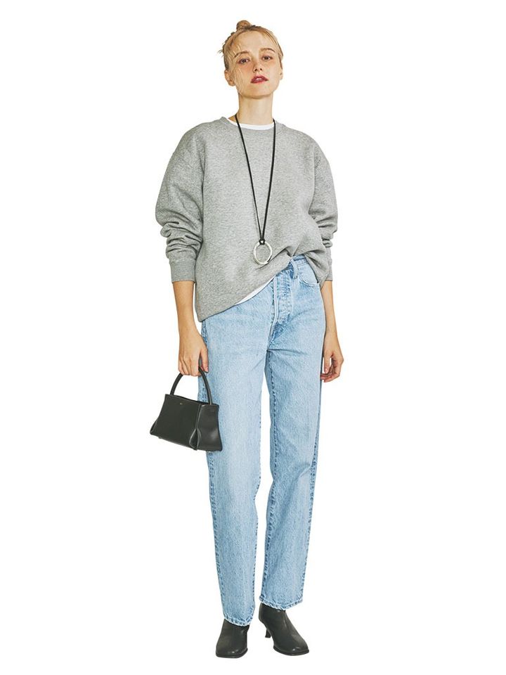 シンプルな装いに映える、クラッシュにペイントといった穿き込んだような味のあるデザイン。脚線のアタリを拾わないゆとりはもたせつつ、ワイドパンツとはならない計算された筒幅により、すらっとまっすぐなレッグラインを演出。生地のしなやかさが淡いブルーとマッチし、女性らしいヘルシーな印象に。