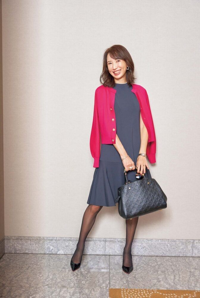 深いグレーが品よく清楚なワンピースに、マゼンタのカーディガンを羽織った藤井奈々さん。「ともに大好きな“アナイ”のものです。ワンピースは衿元にあしらったパールもお気に入り」。バッグは「ルイ・ヴィトン」。