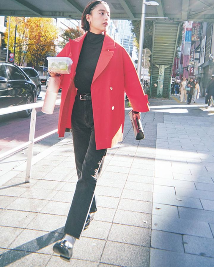 1月1日(水)、全身黒を選んで重たくなりがちなこの時季は、いつもの黒コートを脱いでカラーコートにシフト。縁起のいい赤を選べば気分も高揚しつつ、ドラマティックな配色で街になじみます。中のデニムパンツやニットはオールブラックでシックにまとめてIラインを強調すれば、ほっこり見えを回避します。カラーアイテムが悪目立ちしないようベルトやローファー、バッグなど細部に黒レザーを効かせて大人っぽく引き締めたら、親戚の挨拶回りが好印象に。