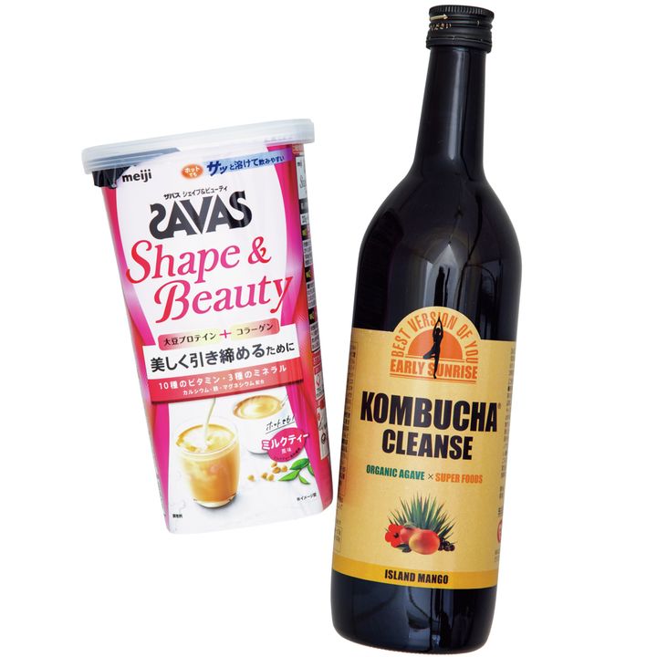 寝起きに体に酵素を入れたいのでアーリーサンライズのコンブチャクレンズを。お仕事で出合いお気に入りに。ザバスのシェイプ&ビューティーでプロテイン補給。